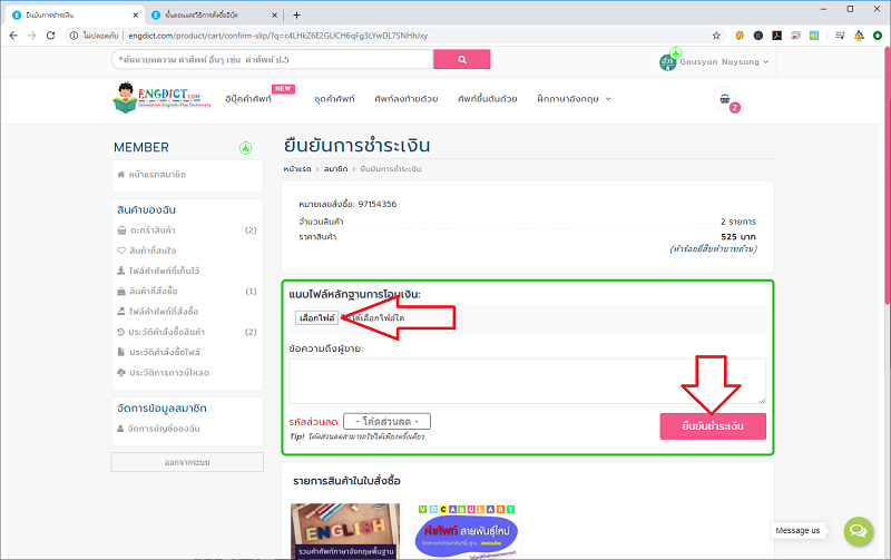 ขั้นตอนที่ 4 ยืนยันการชำระเงิน ท่านสามารถแจ้งสลีปหรือหลักฐานการโอนเงินผ่านระบบของเราได้ ดังภาพ
